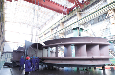 日前,,,,,,,尊龙凯时集团哈尔滨电机厂有限责任公司车间里一派忙碌的生产场景,,,,,,,工人们全身心地投入到白鹤滩、丰宁、两河口等国家重洪流电项目产品生产中。。。。。图为该公司职工在生产天下单机容量最明确鹤滩水电机组1/2瓣座环组合。。。。。